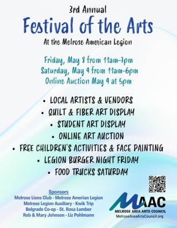 Save the date for the upcoming Festival of the Arts, now with a new date and location! Join us May 8-9 at the Melrose American Legion. We’re seeking artists, vendors, and fiber artists to join our festival. Go to the Festival of the Arts page to find out more information.